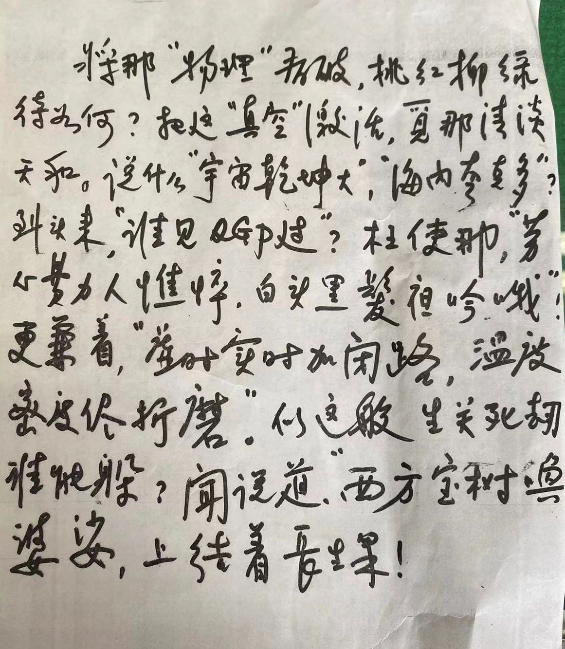 最后,我愿意用苏汝铿写的一首“歪词”来结束,这是多年前他送给我的(半开玩笑半认真)。这首词既显示了苏老师风流倜傥的特性也反映了他对物理的热爱和理解!